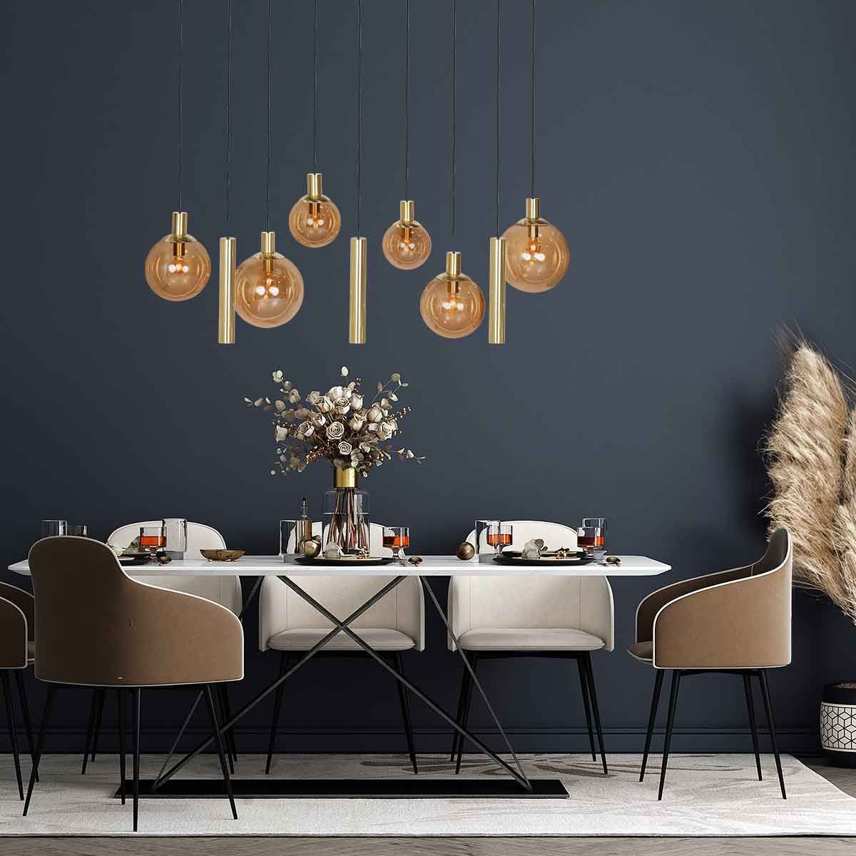 Ontdek de prachtige messingkleurige Hanglamp Bollique 3799ME, een krachtige eyecatcher voor boven grotere tafels. Met 6 glazen bollen en 3 kokers creëert deze lamp een uitgebalanceerde verlichting. De amberkleurige, licht spiegelende bollen variëren in grootte: 20, 25 en 30 cm. De kokers zorgen voor direct licht op de tafel, terwijl de bollen de ruimte subtiel verlichten.