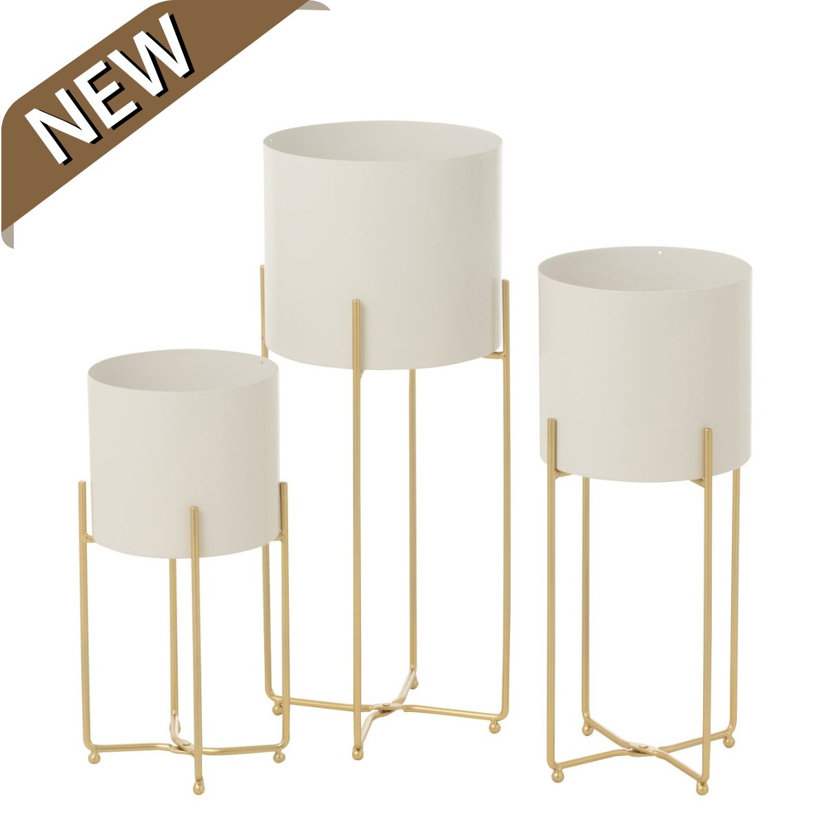 Deze set bevat | L: 24.5cm x B: 23.5 cm x H: 58 cm Bloempot rond ijzer goudkleurig/wit large L: 21.5cm x B: 20.5 cm x H: 49 cm Bloempot rond ijzer goudkleurig/wit medium L: 19.5cm x B: 18 cm x H: 38.5 cm Bloempot rond ijzer goudkleurig/wit small |
