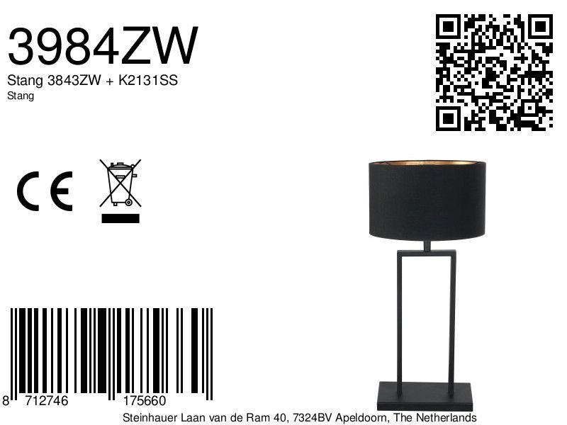 Tafellamp + Lampenkap - Stang - 3984ZW - Zwart/ Goud - Linnen - E27 Fitting